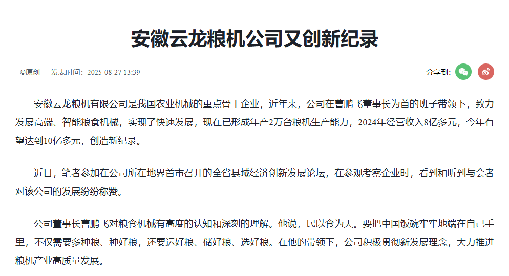 中國工業(yè)新聞網(wǎng):安徽云龍糧機(jī)公司又創(chuàng)新紀(jì)錄